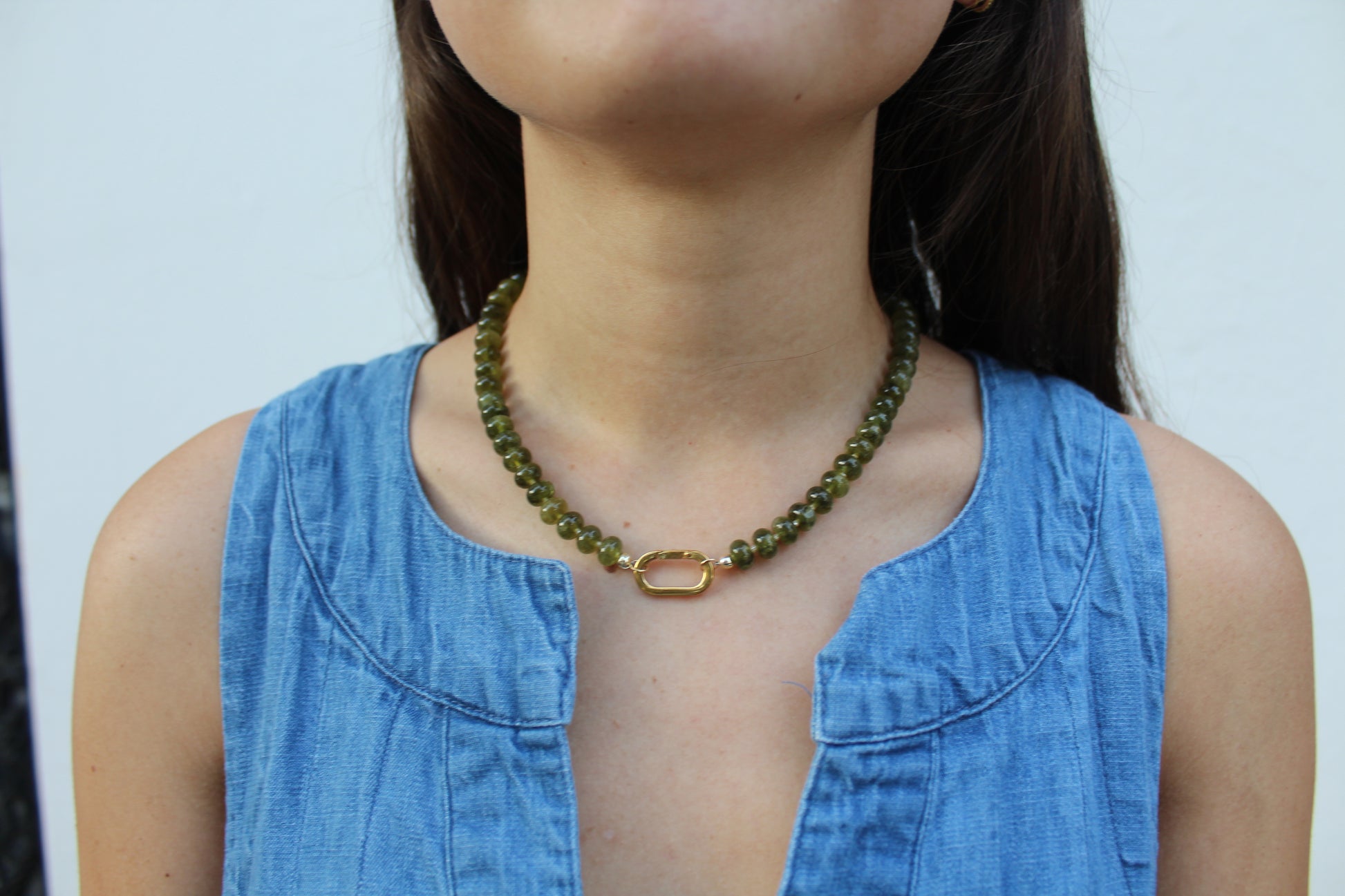 Hand-strung with dark green dyed jade beads and finished with a gold carabiner clasp, this necklace is designed to be worn your way. Turn the clasp to the back for a simple beaded look, or keep it in front to stack your favorite charms— perfect for layering or wearing solo.