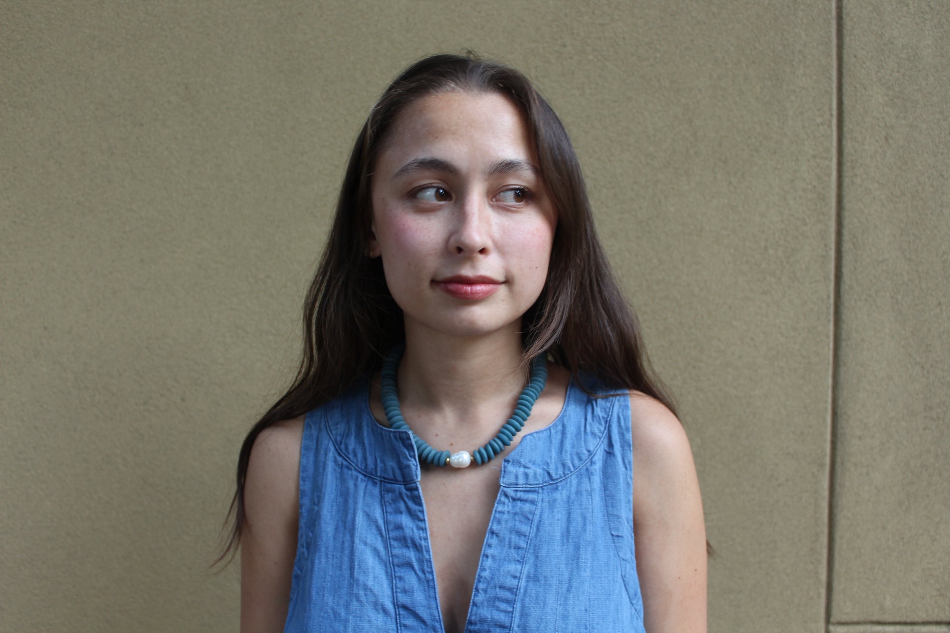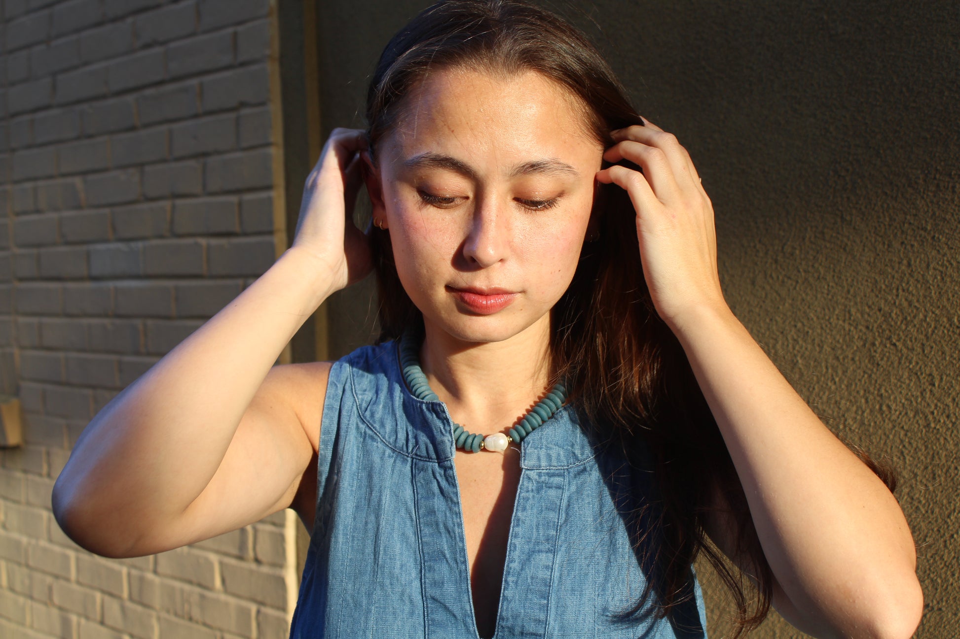 Made with Ashanti saucer beads and accented with a shell pearl in the middle, this necklace is unique and hand-strung to create a piece full of character and story.