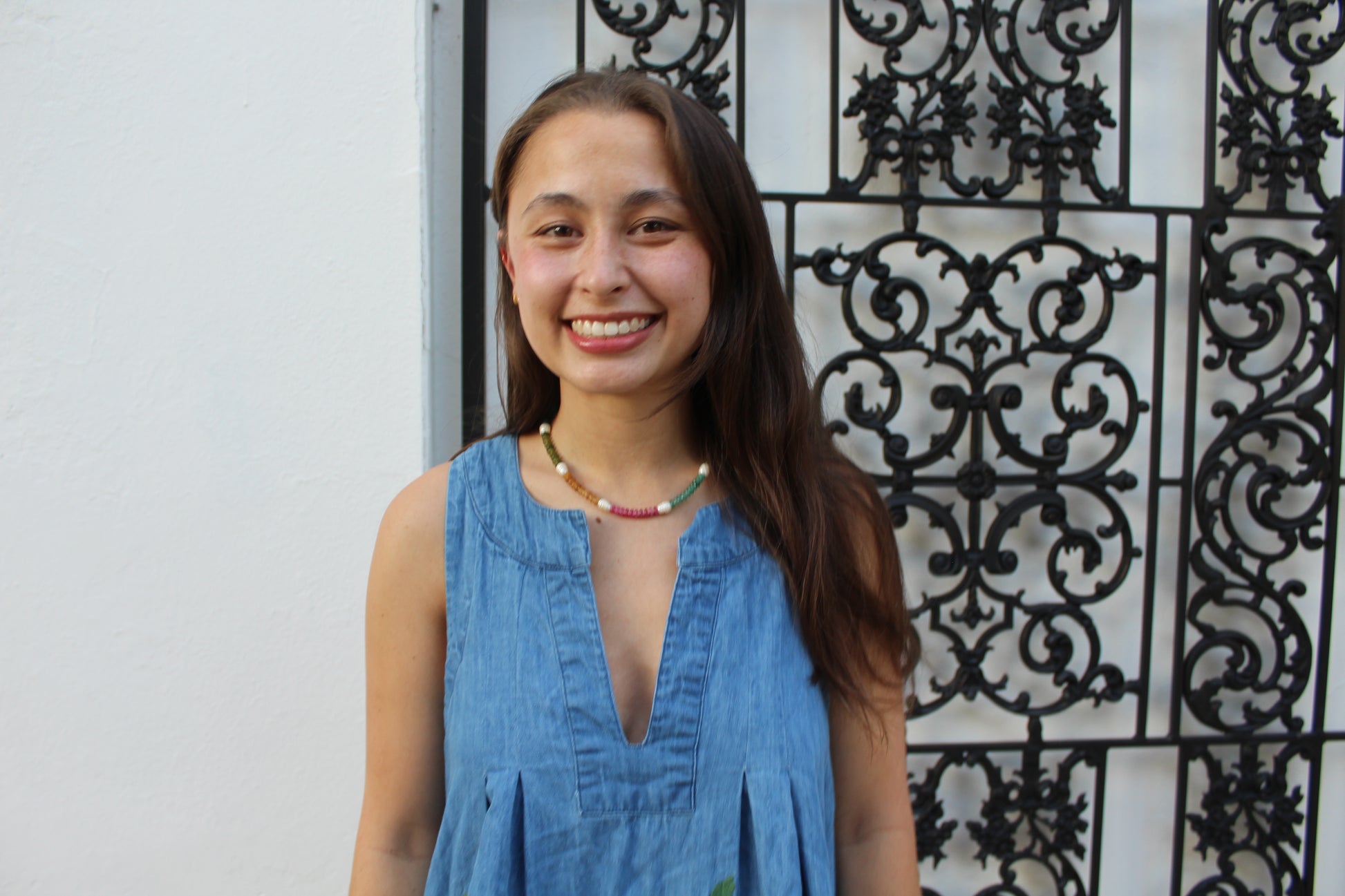 Hand-strung with 2x6mm tourmaline jade beads. This color block beaded pattern has pearls to add a pop.